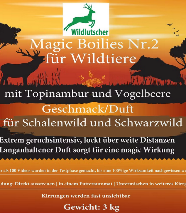Die Wildlutscher Magic Boilies sind ein besonders intensives Lockmittel für die Jagdpraxis. Der spezielle Topinambur Duft wurde in zahlreichen Praxistests optimiert. Der langanhaltende Duft zieht Schalenwild (Rot-, Reh-, Dam-, Sikawild) und Schwarzwild auch über große Distanzen zuverlässig an. Selbst während der Mastzeiten entfalten die Boilies ihre Wirkung, wo herkömmliche Lockmittel versagen.