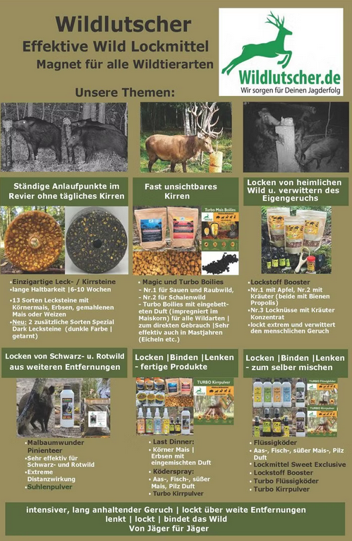 Für das Fernlocken empfiehlt Wildlutscher den Einsatz separater Lockmittel, die eigens für eine starke Duftwirkung entwickelt wurden. Lecksteine und Lockmittel können hervorragend kombiniert werden, um sowohl Distanzwirkung als auch langfristige Wildbindung zu erzielen.