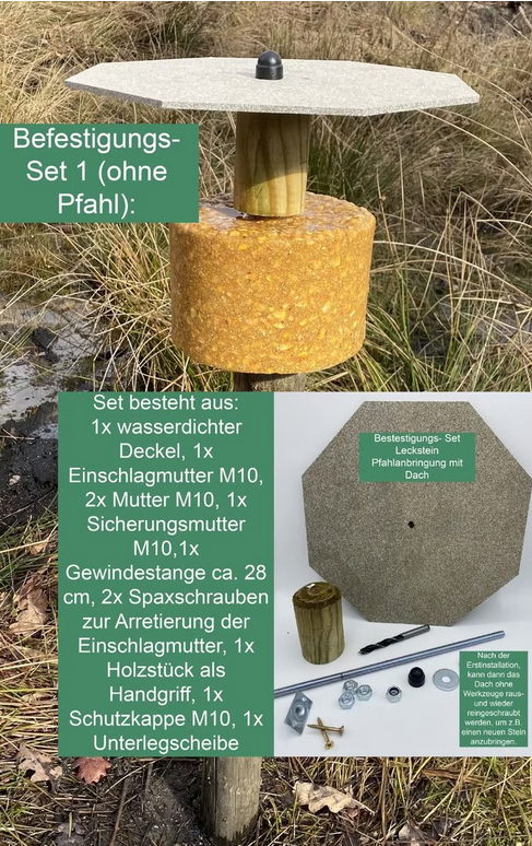 Anbringung: - an einem Baum, - mit 180er Schraube + M20 Unterlegscheibe, - mit einem Seil oder Kette, - auf einem Baumstuggen, - mit einer Eisenstange, - auf einen Pfahl mit Bedachung (empfohlen !) / Vor direkten Regenwasser schützen, z.B. mit einem Brett (Montagesets unter Zubehör) / Verlängert die Haltbarkeit !